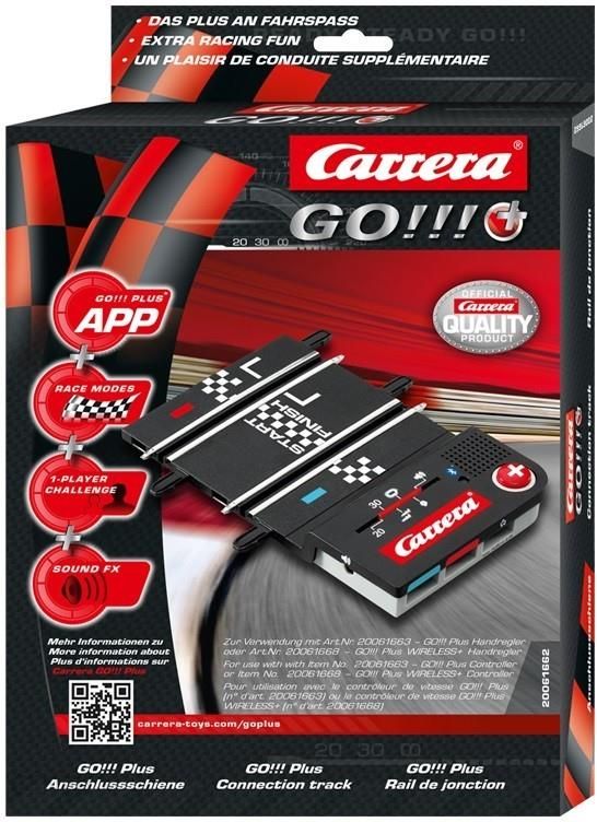 Carrera GO!!! PLUS to system startowy do Świata Wyścigów Carrera, stworzony w skali 1:43. Jest to system Carrera GO!!! wzbogacony o Pit Stop i moduł Bluetooth pozwalający na współpracę poprzez bezpłatną aplikację z urządzeniami dotykowymi z systemem iOS i Android. Dzięki aplikacji musimy podczas wyścigu przeprowadzać dodatkowe czynności na telefonie lub tablecie które uatrakcyjniają zabawę. Do dyspozycji mamy kilka trybów zabawy – nawet wyścig dla 1 zawodnika ( wyścig z duchem).Szyna przyłączeniowa umożliwia wybór trybu wyścigu:20 lub 30 okrążeńPościgTreningSamochód widmo (gra jednoosobowa)Dodatkowo została wyposażona moduł bluetooth oraz głośnik który emituje różne dźwięki i odgłosy silników w trakcie wyścigu. Posiada również gniazdo do podłączenia dodatkowych głośników lub słuchawek