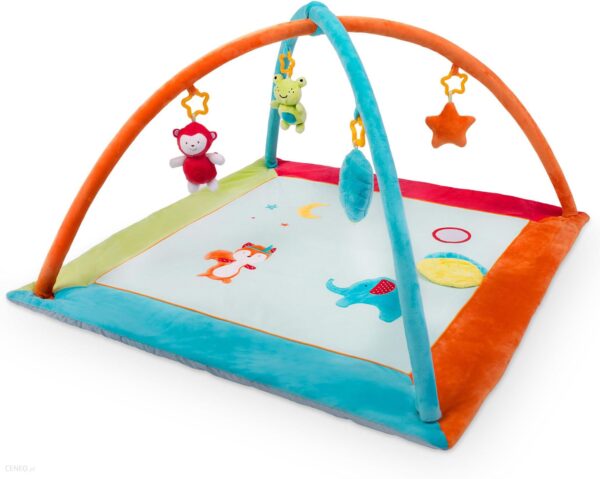 Rozwój Twojego dzieckaZalety korzystania z maty interaktywnej:pomaga w rozwoju fizycznym i motorycznympoprawia koordynację ruchową dzieckażywa kolorystyka, różne kształty oraz miękkie lusterko stymulują zmysł wzroku i wyobraźnięgrzechotki w zabawkach oraz szeleszczące liście stymulują zmysł słuchupluszowe zabawki zapewniają maluchom mnóstwo frajdyLeżenie na miękkiej macie jest bardzo wygodne, ale największą frajdą stanowią dołączone zabawki w zwierzątek, listków i gwiazdek. To chęć odkrywania ich wzmocni mięśnie pleców, ramion i karku u Twojej pociechy. Zatem zabierz swoje dziecko na lisią polanę, by odkryło leśny świat!Zaprojektowana z myślą o najmłodszychPluszowy materiał zewnętrzny maty jest bardzo przyjemny w dotyku. Elastyczne pałąki zostały obłożone miękką pianką oraz również pokryte mięciutkim materiałem. Dolna powierzchnia maty posiada wzmacniany materiał, który jest łatwy w czyszczeniu i zapewnia termoizolację od podłoża.Mata Ricokids została zaprojektowana w taki sposób, aby była w pełni bezpieczna w użytkowaniu. Spełnia ona wszystkie dyrektywy obowiązujące w Unii Europejskiej, dzięki czemu może być używana przez niemowlęta. Produkt zgodny z normami Unii Europejskiej.Specyfikacja:wzór: zwierzątka, kwadratowakolor: niebieski + pomarańczowy + zielony + czerwonyzabawki: 4 szt. wiszące, odpinane; szeleszczące liście, miękkie lusterkopałąki elastyczne, przypinane na klamręwymiary maty: 90 x 90 x 45 cmsugerowany wiek: 0+opakowanie: przeźroczysta torba z zamkiem błyskawicznymprodukt zgodny z normą EN71, oznaczenie zabawek CE