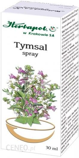 Tymsal aerozol nieżyt gardła i krtaniNaturalny preparat w formie aerozolu o działaniu antyseptycznym i ściągającym na błony śluzowe jamy ustnej i gardła. Wskazaniami do stosowania preparatu Tymsal są: schorzenia górnych dróg oddechowych (nieżyty krtani i gardła, kaszel, stany zapalne jamy ustnej i gardła).DziałaniePreparat o działaniu antyseptycznym i ściągającym na błony śluzowe jamy ustnej i gardła.ZastosowanieSchorzenia górnych dróg oddechowych:* nieżyty krtani i gardła* kaszel* stany zapalne jamy ustnej i gardła.PrzyjmowanieRozpylać w jamie ustnej 3-4 krotnie, 3 razy dziennie.Nie stosować dłużej niż 7 dni.NiepożądaneW bardzo rzadkich przypadkach możliwe jest wystąpienie reakcji nadwrażliwości, objawiających się m.in. dusznością, pokrzywką i miejscowymi obrzękami.PrzeciwwskazaniaNadwrażliwość na tymianek lub szałwię. Nie stosować u dzieci do 12 roku życia.SkładSkład produktu w przeliczeniu na 100g:Thymi extractum fluidum 1:3 (wyciąg tymiankowy płynny) – 70g, ekstrahent: mieszanina wodorotlenku amonowego (96 g/l), glicerolu (860 g/l), etanolu (760 g/l) i wody (1:20:67, 8:11,2).Salviae tinctura 1:5 (nalewka z szałwii) – 30gEkstrahent: etanol 70%.Produkt zawiera 38-47 % obj. etanolu.